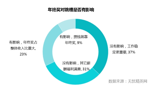 但是即便大部分人對今年的年終獎(jiǎng)的增長沒有信心,卻很難讓他們因?yàn)槟杲K獎(jiǎng)而跳槽。半數(shù)以上的受訪者年終獎(jiǎng)?wù)既晔杖氲谋壤齼H為20%左右,即便不滿意年終獎(jiǎng),但工作的穩(wěn)定性、工作環(huán)境、企業(yè)福利是他們更看重的要素。有3成受訪者表示收入依賴年終獎(jiǎng),如果年終獎(jiǎng)不滿意一定會(huì)尋找機(jī)會(huì)跳槽。因此企業(yè)在人才管理上,需要特別注意年終獎(jiǎng)對于員工保留的影響,提前做好預(yù)防工作。