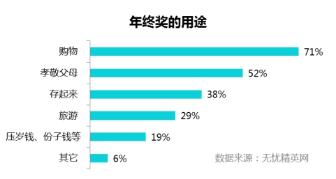 在年終獎(jiǎng)的使用上,71%的人會(huì)用于購物,52%的人會(huì)用于孝敬父母,38%的人會(huì)將年終獎(jiǎng)存一部分起來,29%的會(huì)用于旅行。超過一半的人,以上年終獎(jiǎng)的使用類別超過了3項(xiàng),人生的那點(diǎn)小夢想,全仰仗年終獎(jiǎng)?!捌綍r(shí)每個(gè)月還完房貸,收入只夠生活,提升生活質(zhì)量,全靠年終獎(jiǎng),去年的年終獎(jiǎng),我給自己買了臺(tái)蘋果筆記本電腦;今年的年終獎(jiǎng),準(zhǔn)備用來去普吉島旅行,沒有年終獎(jiǎng)肯定要哭死?!?剛在上海買了房的小杰告訴我們。