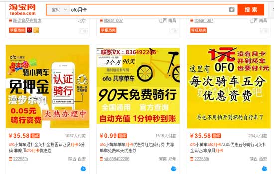人民網IT頻道記者在調查中發(fā)現,在摩拜和ofo的月卡漲價5-10倍的同時,兩家公司大量的高折扣優(yōu)惠卡卻轉移到淘寶等電商平臺公開出售,在淘寶上輸入“摩拜月卡”、“ofo月卡”則出現了大批免押金、8.8元包月、9.99元包月、0.05元騎行資費的廣告,這些高折扣的優(yōu)惠卡從何而來,卻是一個謎。