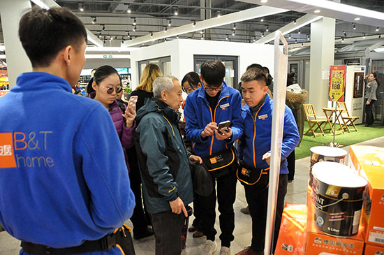 3月3日上午,百安居北京金四季店的工作人員幫顧客注冊會員。