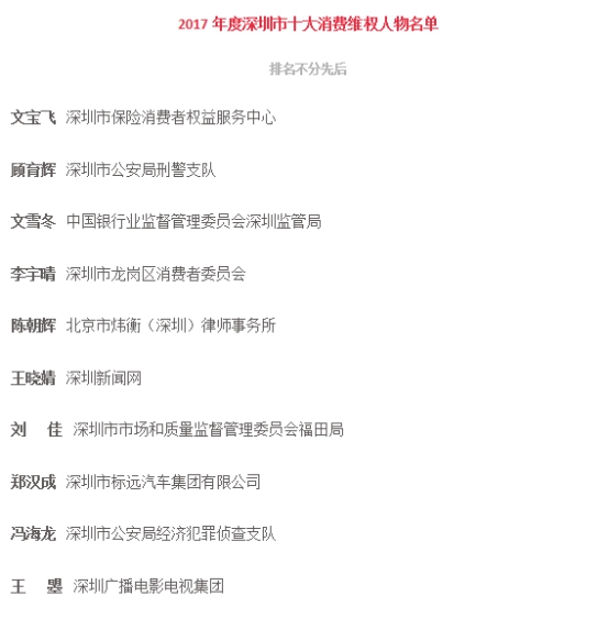 附:“2017年度深圳市十大最美消費維權人物”名單(排名不分先后)