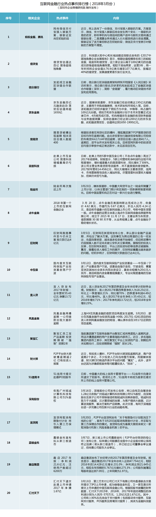 互聯(lián)網(wǎng)金融行業(yè)熱點事件排行榜榜單說明:本榜單主要通過計算機(jī)系統(tǒng)對輿情數(shù)據(jù)的自動采集、整理和分析,結(jié)合輿情分析師的篩選和研判,對2018年3月1日至3月31日這一時段內(nèi)互聯(lián)網(wǎng)金融領(lǐng)域的熱點輿情事件(主要是涉企輿情)作出綜合評估而得。主要評估指標(biāo)包含新聞報道指數(shù)、微博擴(kuò)散指數(shù)、論壇參與指數(shù)和境外炒作指數(shù),在上述指標(biāo)基礎(chǔ)上,根據(jù)相關(guān)算法得出事件綜合影響力指數(shù),按照指數(shù)大小進(jìn)行排序。