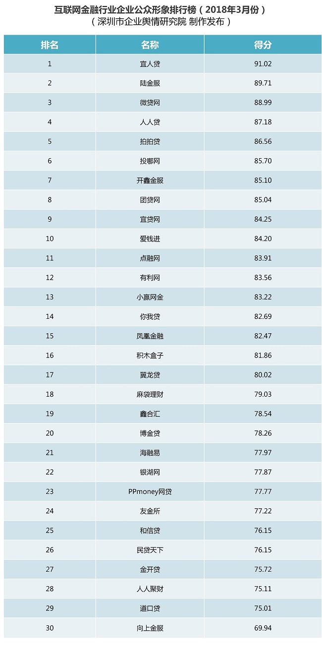 互聯(lián)網(wǎng)金融行業(yè)企業(yè)公眾形象排行榜:本榜單根據(jù)公開可查的信息、數(shù)據(jù),從規(guī)模實力、合規(guī)性、交易金額、信披透明度、輿論曝光度和負(fù)面影響等六個維度,對2018年3月1日至3月31日這一時段內(nèi)互聯(lián)網(wǎng)金融行業(yè)各企業(yè)的公眾形象進(jìn)行綜合評估并排名,旨在對互聯(lián)網(wǎng)金融行業(yè)各企業(yè)開展品牌形象塑造、宣傳推廣策略、公共關(guān)系維護(hù)、品牌影響力等方面的綜合評價,既幫助相關(guān)企業(yè)找準(zhǔn)合適的品牌定位、發(fā)展方向,也為消費(fèi)者和投資者提供科學(xué)、公正、獨(dú)立的消費(fèi)和投資決策參考。