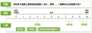 請用戶回答“您在多大程度上愿意向您的朋友(親人、同事……)推薦XX公司/產品?”根據用戶的推薦意愿,將用戶分為三類:推薦者(得分在9-10之間)、被動者(得分在7-8之間)、貶損者(得分在0-6之間)。
