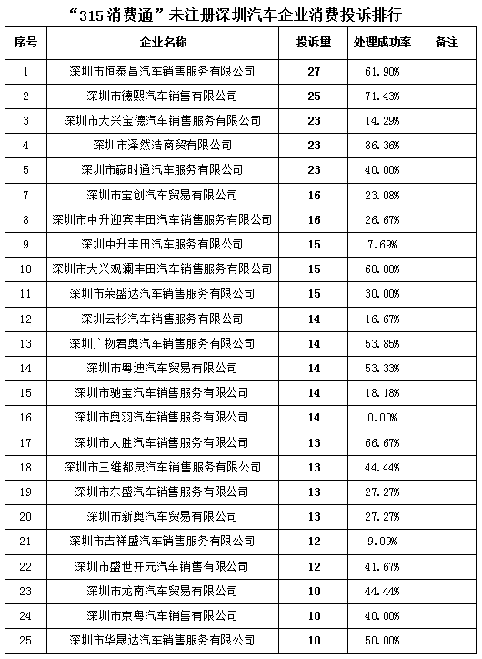 二、“315消費(fèi)通”未注冊(cè)深圳汽車企業(yè)消費(fèi)投訴排行
