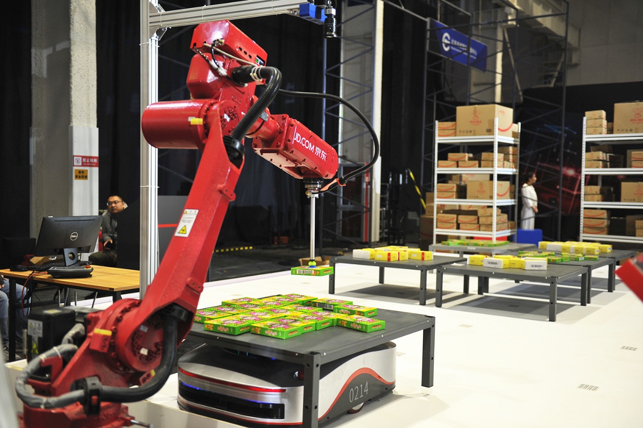 為了展現(xiàn)無人倉的全程智能化流程,本次峰會外展區(qū)設(shè)置了智能動態(tài)展區(qū)。在現(xiàn)場,動態(tài)運行的揀選機械臂、自動打包機與飛馬機器人、智能叉車等一起,共同構(gòu)成了京東無人倉強大的倉儲系統(tǒng)。目前在京東智能化倉儲體系內(nèi),智能機器人設(shè)備已經(jīng)實現(xiàn)了家用電器、美妝個護(hù)、電腦辦公、服飾內(nèi)衣、醫(yī)療保健等五大訂單品類的應(yīng)用場景覆蓋,通過地狼、天狼、分揀AGV、交叉帶分揀機、AGV叉車、機械臂等12種自主研發(fā)機器人的投用,大大提升了京東的訂單處理效率。