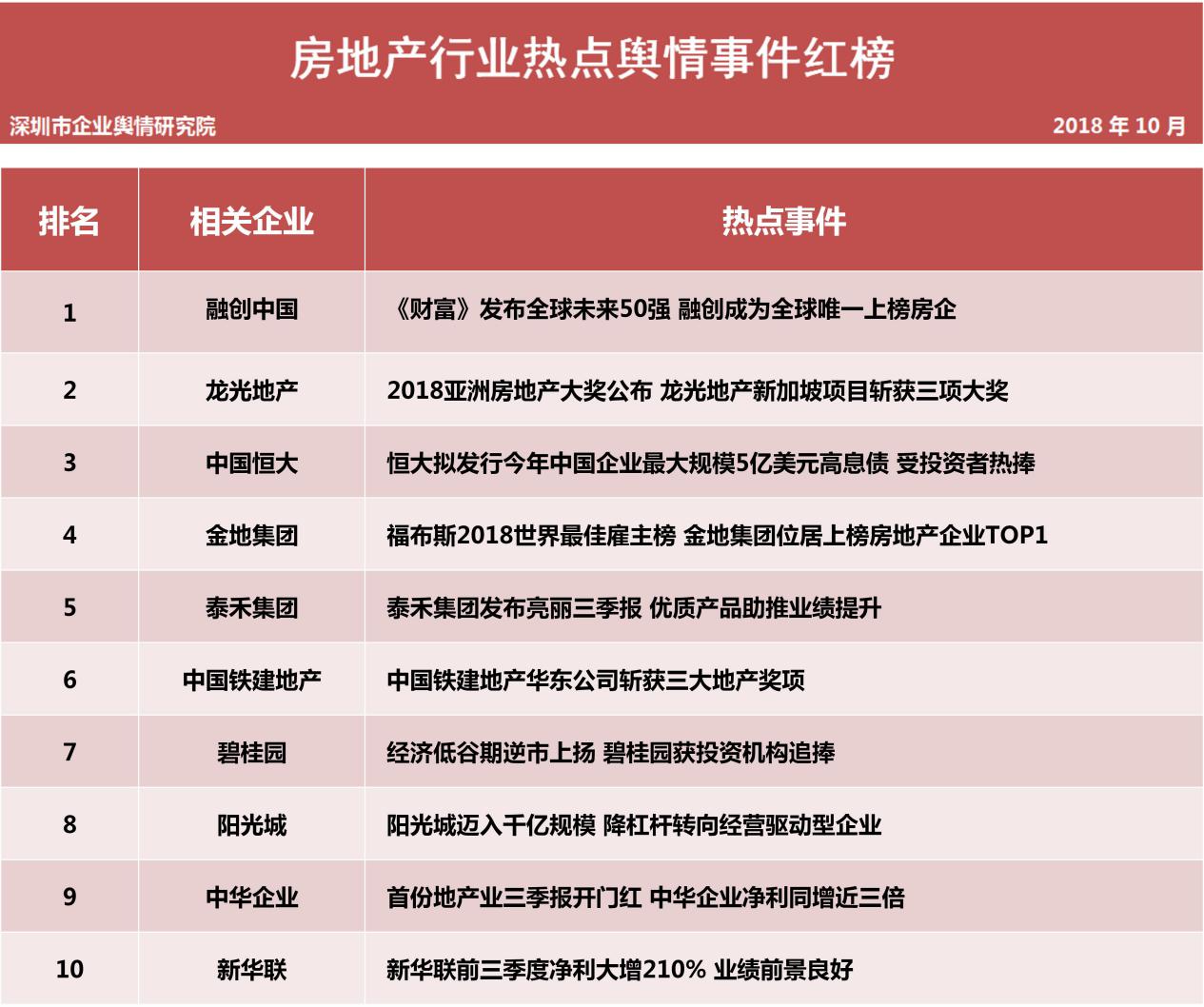 本榜單主要通過計算機(jī)系統(tǒng)對輿情數(shù)據(jù)的自動采集、整理和分析,結(jié)合輿情分析師的篩選和研判,對2018年10月1日至10月31日這一時段內(nèi)房地產(chǎn)領(lǐng)域的熱點輿情事件作出綜合評估,主要評估指標(biāo)包含新聞報道指數(shù)、微博擴(kuò)散指數(shù)、論壇參與指數(shù)、境外炒作指數(shù)。