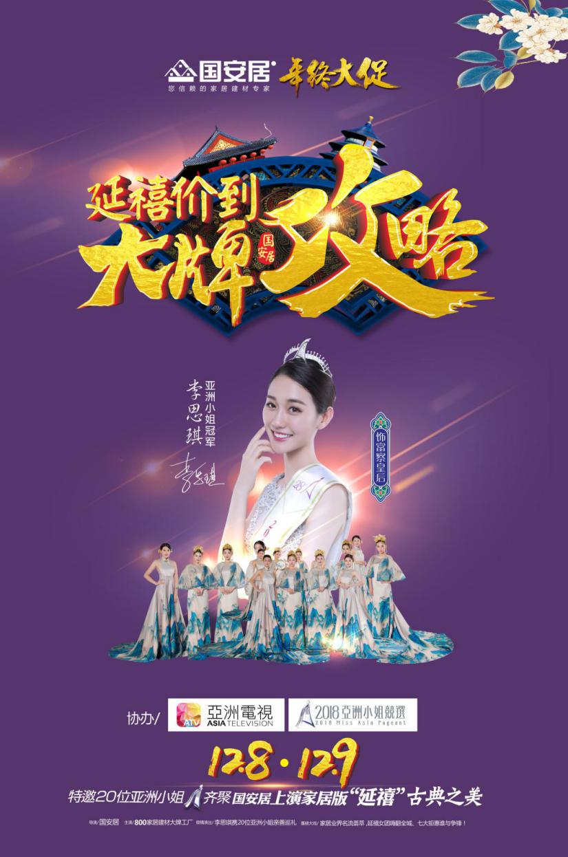 作為2018年收官之作,國(guó)安居非常重視此次年終盛典,力求將本次盛典做大做好,以回饋廣大新老顧客的長(zhǎng)期支持與厚愛。為此,國(guó)安居本次特邀2016亞姐冠軍李思琪攜手20位2018亞洲小姐候選佳麗親臨國(guó)安居親善巡禮,集智慧與美麗于一身的亞姐佳麗帶您領(lǐng)略“延禧攻略”古典之美。為廣大業(yè)主獻(xiàn)上一場(chǎng)美輪美奐的古典文化視覺盛宴。
