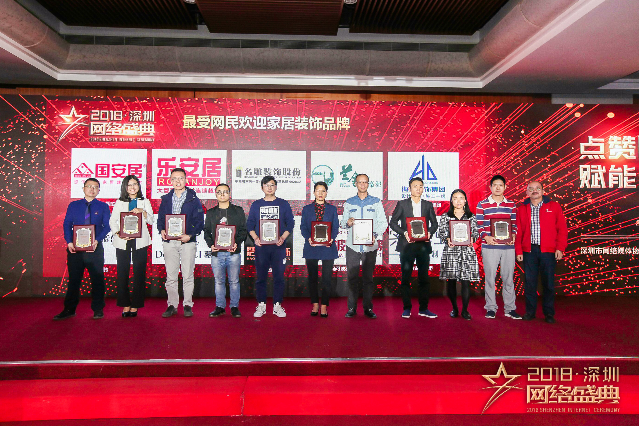 盛典現(xiàn)場“2018年度十大行業(yè)最受網(wǎng)民歡迎品牌”獲獎名錄正式對外公布。國安居;樂安居;名雕裝飾股份;蘭舍硅藻泥;海大裝飾;東鵬瓷磚;慕思寢具;浩天裝飾;馬可波羅瓷磚;索菲亞衣柜10個品牌獲得“2018年度家居裝飾行業(yè)最受網(wǎng)民歡迎品牌”榮譽(yù)稱號。