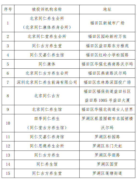 具體被投訴機構(gòu)名單(由消費者提供的名稱及地址)如下: