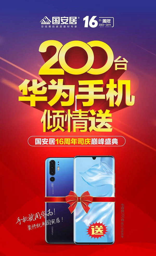 時光有限,堅(jiān)持無限,國安居16年里始終如一的堅(jiān)持做著一件事情:顧客至上,服務(wù)第一,誠信為本!為回報(bào)廣大家居消費(fèi)者一直的厚愛,國安居深惠七店在此16周年之際,攜手旗下1000余家一線大牌舉行“16周年司慶巔峰盛惠,200臺華為手機(jī)傾情送”大型促銷活動。