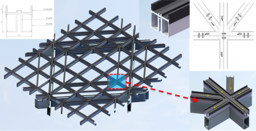 由于每一個小“盒子”的顏色都是獨一無二的,需要在生產(chǎn)階段為每一塊零件編號,并在安裝時按編號一塊一塊進(jìn)行組合。更讓項目部犯難的是,在根據(jù)原有方案進(jìn)行樣板安裝時,“盒子”全部下垂,原因是菱形盒子突出內(nèi)層幕墻1米,難以固定支撐。后經(jīng)反復(fù)研究試驗,決定在裝盒子前,在墻上做一個外觀似蜘蛛網(wǎng)的控制體系,為每個菱形盒子準(zhǔn)確定位,將安裝精度控制在毫米級。