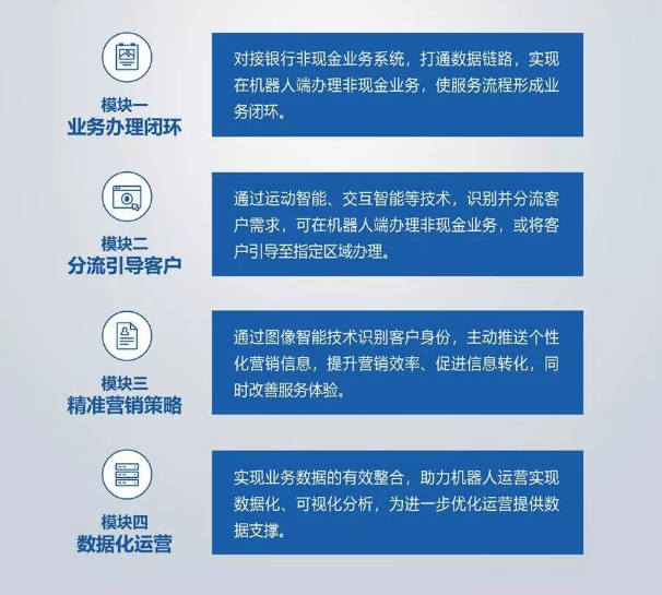 人工智能機(jī)器人與金融業(yè)務(wù)的完美結(jié)合,助力加速金融網(wǎng)點(diǎn)智能化建設(shè)、提升營(yíng)銷(xiāo)效率、豐富金融營(yíng)銷(xiāo)場(chǎng)景。