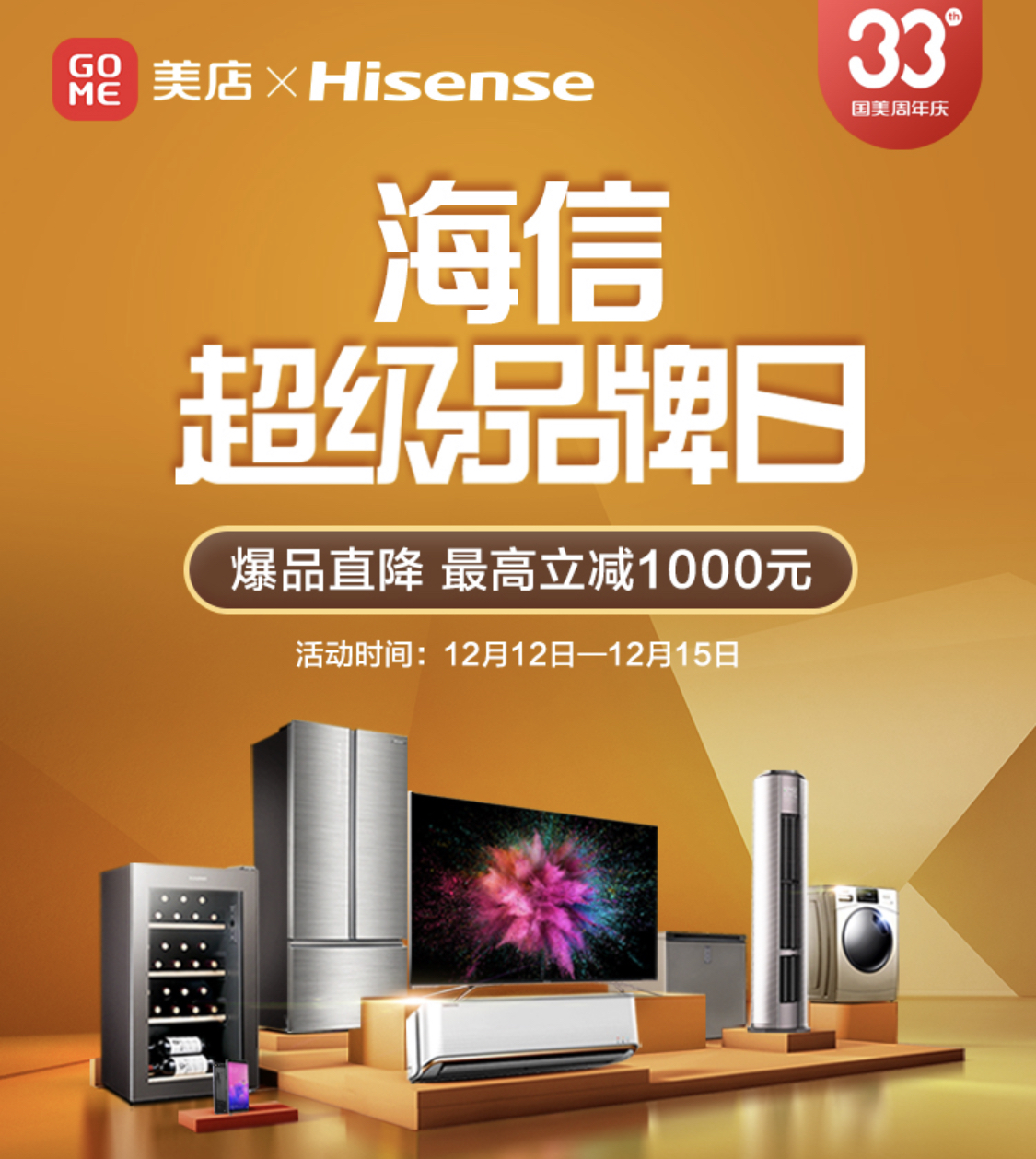 深圳新聞網(wǎng)2019年12月12日訊 12月12日-15日,國美33周年慶活動已經(jīng)啟動,屆時消費(fèi)者可在深圳國美門店參與“全場好物,第二件5折起”活動。同時,海信、海爾、美的超級品牌日活動也將于12日-15日期間在國美美店展開。用戶在國美APP中美店活動專區(qū)便可參與到活動中來,下面為大家介紹下本次海信超級品牌日的重磅爆品,全場最高立減1000元,還有機(jī)會獲得愛奇藝四端VIP會員卡和小度音箱等福利獎品,不要錯過。