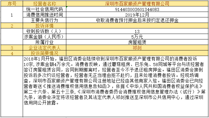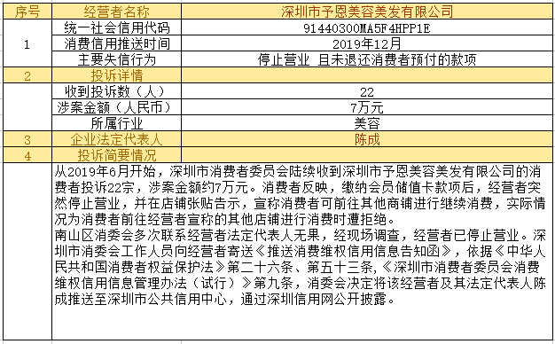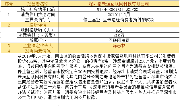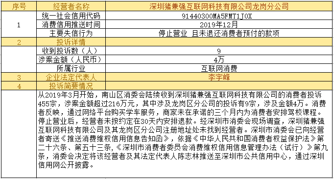 深圳新聞網(wǎng)2019年12月24日訊12月24日,為加強(qiáng)對(duì)商品和服務(wù)的社會(huì)監(jiān)督,推進(jìn)消費(fèi)領(lǐng)域信用體系建設(shè),深圳市消費(fèi)者委員會(huì)(以下簡(jiǎn)稱“深圳市消委會(huì)”)聯(lián)合福田區(qū)消費(fèi)者委員會(huì)(以下簡(jiǎn)稱“福田區(qū)消委會(huì)”)和龍崗區(qū)消費(fèi)者委員會(huì)(以下簡(jiǎn)稱“龍崗區(qū)消委會(huì)”)將深圳豬兼強(qiáng)互聯(lián)網(wǎng)科技有限公司、深圳市皇域貿(mào)易有限公司、深圳市百家順資產(chǎn)管理有限公司、深圳市予恩美容美發(fā)有限公司、深圳晶馨瑜伽有限公司等五家預(yù)付式和互聯(lián)網(wǎng)消費(fèi)領(lǐng)域停止?fàn)I業(yè)且未退還消費(fèi)者預(yù)付款項(xiàng)的經(jīng)營(yíng)者及其主要負(fù)責(zé)人推送至深圳市公共信用中心,通過深圳信用網(wǎng)公開披露。