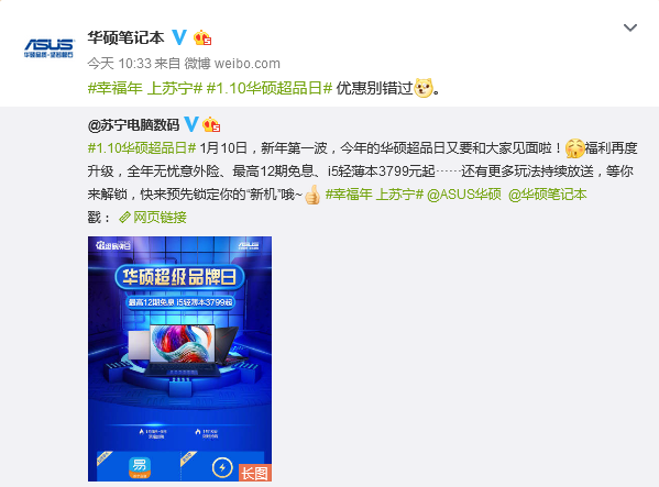 1月10日,今年的蘇寧易購(gòu)華碩超品日將再次啟動(dòng),1月3日正式進(jìn)入預(yù)熱階段,今天早上蘇寧電腦數(shù)碼官微賬號(hào),發(fā)布了今年華碩超級(jí)品牌日活動(dòng)的正式信息,華碩官方賬號(hào)也第一時(shí)間與之進(jìn)行了回應(yīng)互動(dòng)。