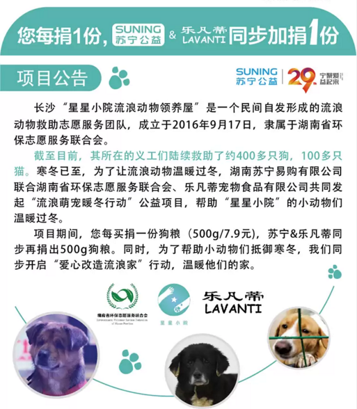 活動期間,愛心人士只需要以7.9元的折扣價,在蘇寧易購線上購買一斤樂凡蒂狗糧就可完成捐贈。