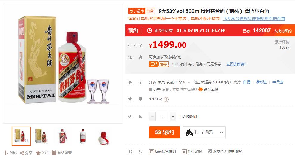 買年貨上蘇寧,買好酒上蘇寧。要說年貨節(jié)期間,蘇寧超市酒水類目的明星產(chǎn)品,還要屬1499元的飛天茅臺酒。年貨節(jié)期間,蘇寧已經(jīng)啟動了多輪的飛天茅臺酒的預約搶購,而1月10日即將迎來新一輪的搶購。截至1月8日上午10點多,已經(jīng)有超過14萬實名認證super會員參與了本次預約。