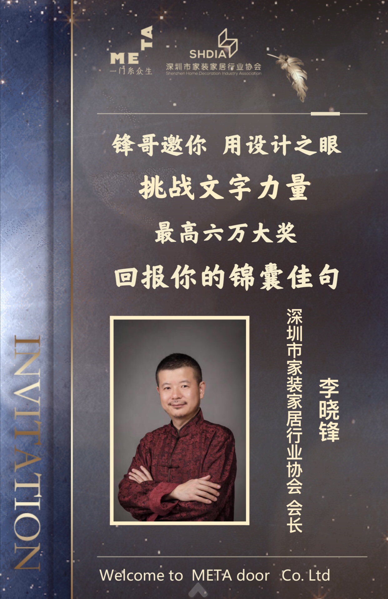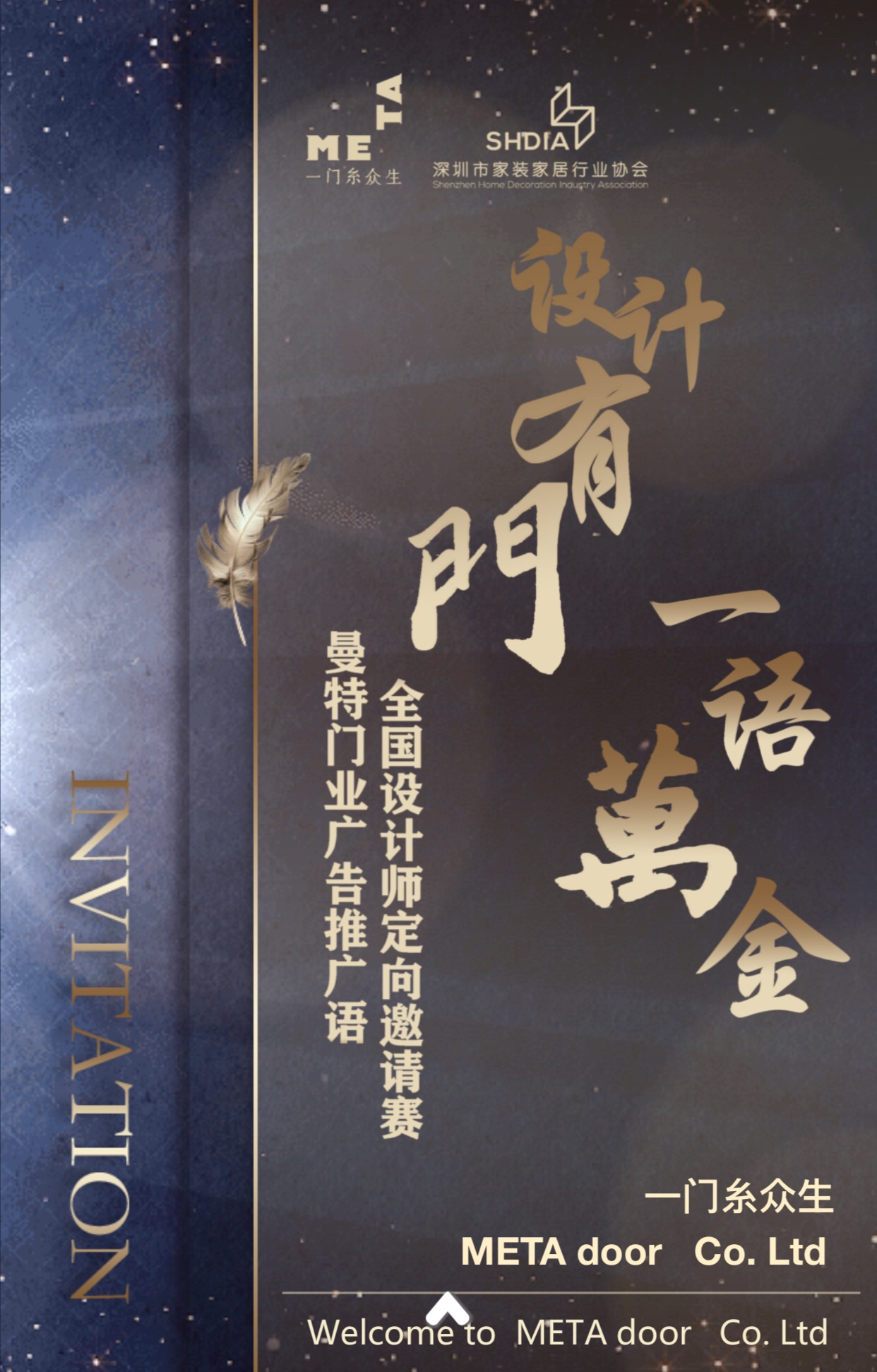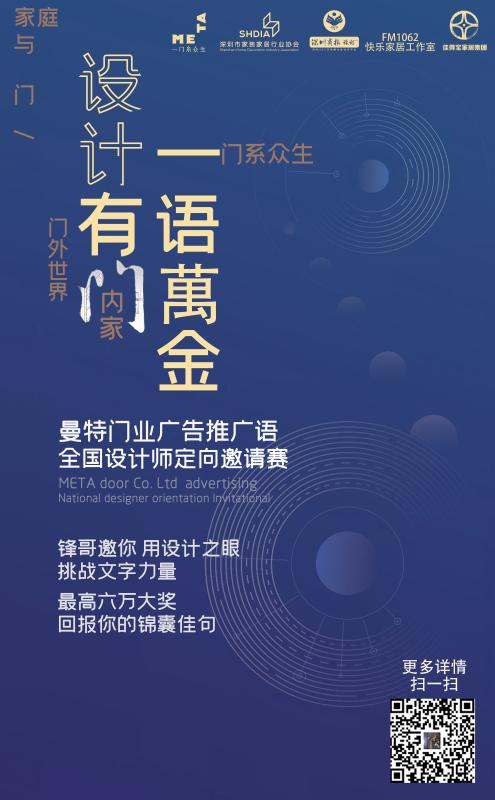 “設(shè)計有門,一語萬金”深圳市家裝家居行業(yè)協(xié)會、深圳商報、FM106.2《快樂家居》工作室聯(lián)手曼特門業(yè)舉辦的曼特門業(yè)廣告推廣語全國設(shè)計師定向邀請賽,在2020年1月1日正式啟動啦。