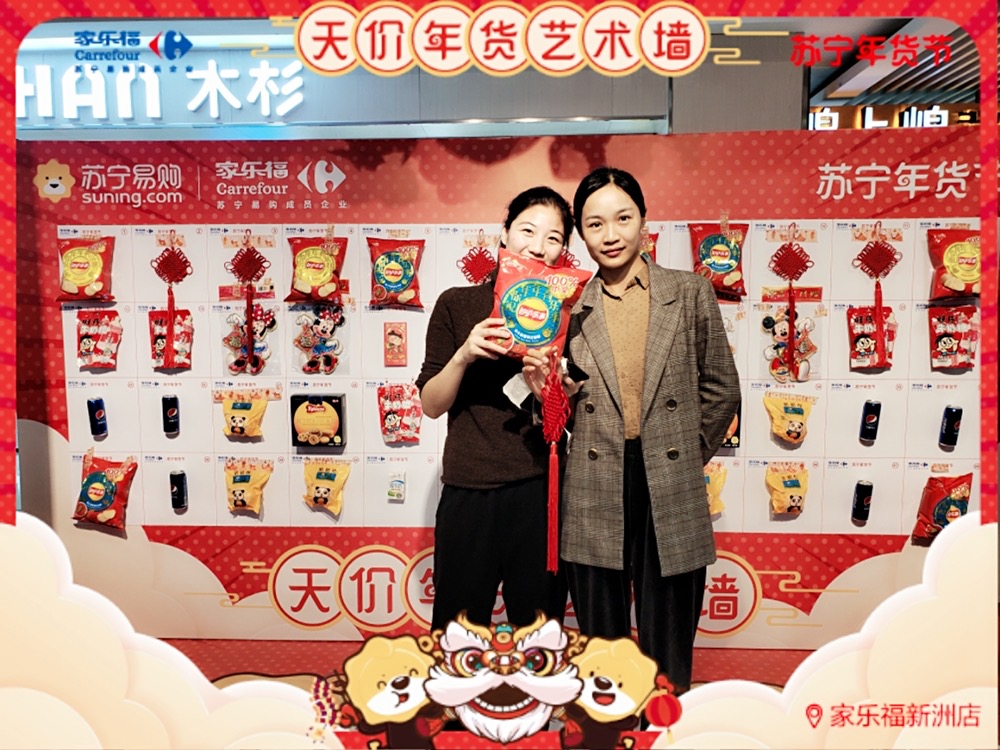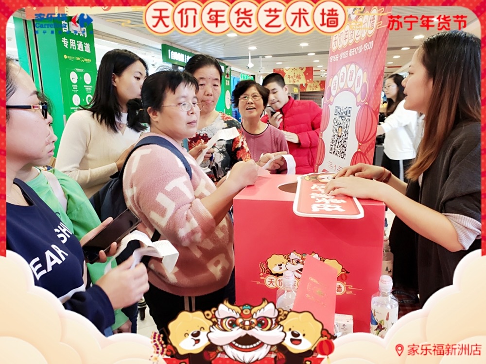 天價(jià)年貨藝術(shù)墻,藝術(shù)年貨送不停 ! 1月17日 至 1月 19 日 , 家樂福華南區(qū)廣州員村店、珠海吉大店、福州寶龍店 、廈門中華城店及 深圳新洲店 (活動(dòng)時(shí)間為1.16-1.18) 活動(dòng)繼續(xù) 。 禮品數(shù)量有限,每天送完即止 !蘇寧家樂福 實(shí)力助你過年味滿滿的春節(jié) ,邀請您 來把年貨驚喜領(lǐng)回家 !