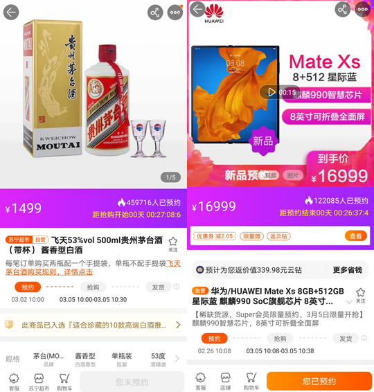 截止到開(kāi)售前,蘇寧易購(gòu)平臺(tái)飛天茅臺(tái)預(yù)約量將近46萬(wàn)人,華為Mate Xs預(yù)約量超過(guò)12萬(wàn)人,兩款高端產(chǎn)品在蘇寧易購(gòu)累計(jì)預(yù)約人數(shù)達(dá)到58萬(wàn)人,值得注意的是,這兩款在各自領(lǐng)域的頂尖高端產(chǎn)品,蘇寧易購(gòu)SUPER會(huì)員可預(yù)約購(gòu)買(mǎi),8分鐘內(nèi)有58萬(wàn)人瞄準(zhǔn)這兩款產(chǎn)品,并且都是一經(jīng)開(kāi)售就被快速搶完,左手茅臺(tái)右手華為Mate Xs,消費(fèi)熱情不減。