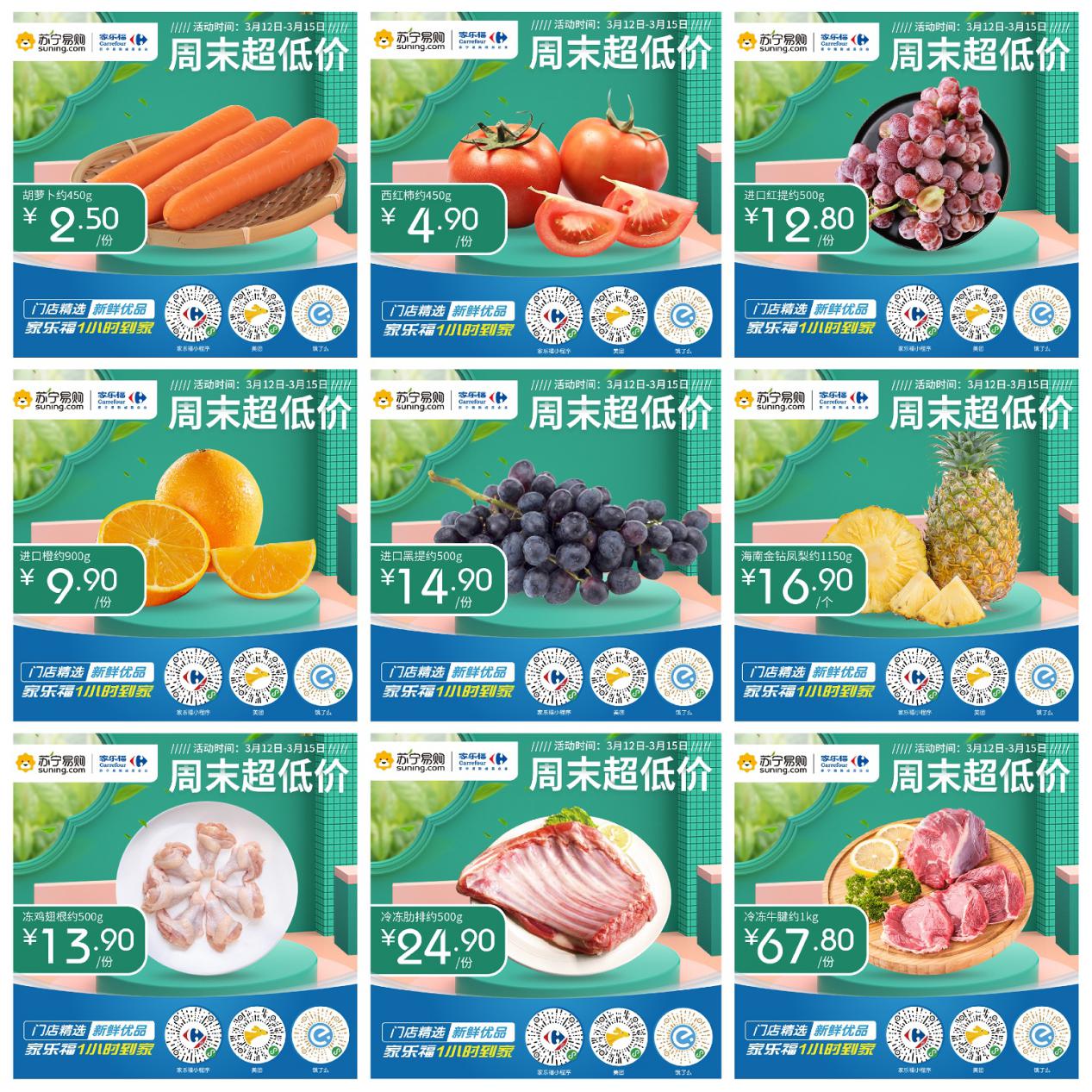 又到周末了,大伙兒再買點菜在家做做飯吧!家樂福生鮮招牌——“周末超低價”系列單品搶“鮮”看!胡蘿卜、西紅柿、橙子、黑提、紅提、金鉆鳳梨、雞翅根、肋排、牛腱,全方位滿足你挑剔的大“胃”口!