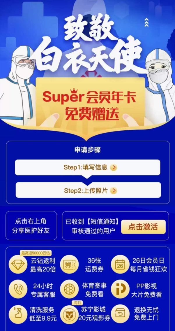3月30日,蘇寧宣布加碼此次活動,Super會員贈送對象不僅包括具備執(zhí)業(yè)資格證書的醫(yī)生和護士,還包括藥師和技師,藥師和技師包含不限于放射影像科技師、檢驗科技師、口腔科技師、藥劑師、康復治療師等。消息發(fā)布后,藥師申請人數(shù)日均環(huán)比增長達89%,技師申請人數(shù)日均環(huán)比增長達145%。醫(yī)院行政、公共衛(wèi)生醫(yī)師、感染管理、海關(guān)衛(wèi)生檢疫人員、救護車駕駛員、心理治療師、醫(yī)院信息科工程師等人員也紛紛遞交申請。