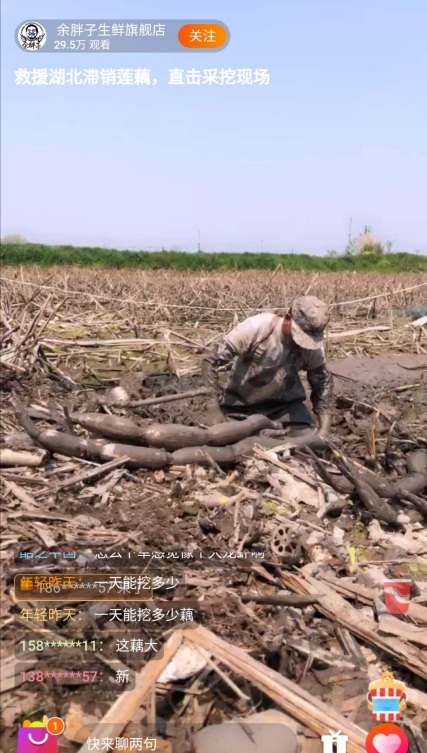 除了湖北的縣長、市長外,普通的湖北商戶不甘落后。8日上午,荊州洪湖的陽光明媚,“余胖子生鮮旗艦店”的店主便打開手機(jī)接通了直播,樸實(shí)的農(nóng)民性格讓他面對(duì)鏡頭一時(shí)不知該說什么好,簡單問好后,他就轉(zhuǎn)身下了塘,開始從厚重的泥土里拔出一根根新鮮的蓮藕。有不少00后網(wǎng)友是第一次見到挖藕的過程,他們發(fā)現(xiàn)原來潔白爽口的大藕居然是從泥中挖出來的,“挖藕真的太不容易了,一個(gè)上午要泡在塘泥里。”