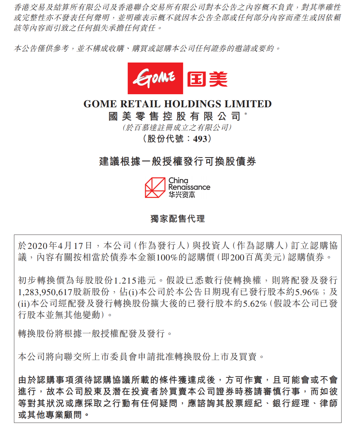 公告稱,拼多多以總計2億美金的可轉換債券方式對國美進行戰(zhàn)略投資。根據(jù)協(xié)議,初步股份轉換價為每股1.215港元,分別較國美零售2020年4月17日收盤價及截至2020年4月16日前五個連續(xù)交易日之平均收盤價溢價66.44%及68.75%。