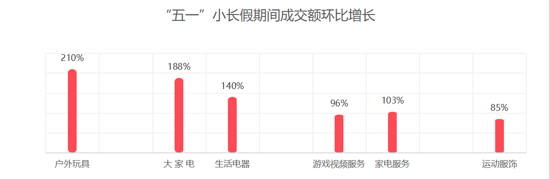“五一”小長(zhǎng)假期間,國(guó)產(chǎn)商品的成交額同比增長(zhǎng)了52%。國(guó)產(chǎn)的生鮮產(chǎn)品十分豐富,農(nóng)產(chǎn)品觸網(wǎng)利用信息經(jīng)濟(jì)快速的將地方市場(chǎng)轉(zhuǎn)化為全國(guó)市場(chǎng),成交額同比增長(zhǎng)了148%。此外,國(guó)產(chǎn)的家電、農(nóng)資園藝、清潔用品及廚具的成交額同比增長(zhǎng)較高。