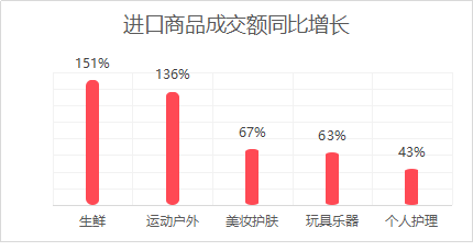 隨著人們生活水平的提升,進(jìn)口生鮮成交額同比增長(zhǎng)了151%。近幾年,進(jìn)口生鮮的價(jià)格門(mén)檻下降,尤其是進(jìn)口的奶制品、豬肉、牛肉的價(jià)格跟國(guó)產(chǎn)商品十分接近。此外,借助于品牌優(yōu)勢(shì),進(jìn)口的運(yùn)動(dòng)戶外、美妝護(hù)膚、玩具樂(lè)器、個(gè)人護(hù)理等商品的成交額同比增長(zhǎng)也比較高。