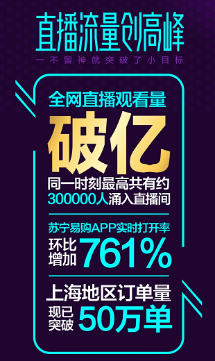 22點(diǎn)30分,直播正式進(jìn)入蘇寧時(shí)間。江疏影化身蘇寧“福利官”與主持人周瑾在線安利蘇寧好物,直播吸引在線觀眾上億人次圍觀“剁手”,同一時(shí)刻最高峰30萬(wàn)人涌入直播間。