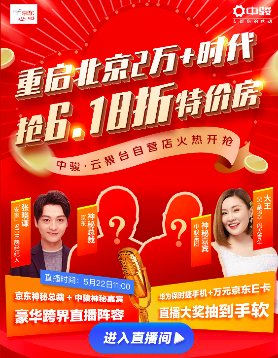 值得關注的是,中國內(nèi)地男演員張曉謙、奇葩說選手大王、以及京東和中駿的兩位“神秘嘉賓”還將在5月22日上午11點帶來直播,在線預售全新房源,并將一套6.18折的特價房開展618抽獎活動,優(yōu)惠后僅需一百多萬元即可拿下一套北京新房。