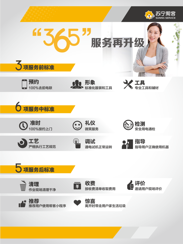 “三分產(chǎn)品七分安裝”,超60萬(wàn)套空調(diào),如何保障快速及時(shí)的安裝?蘇寧幫客負(fù)責(zé)人告訴記者,蘇寧全國(guó)區(qū)域空調(diào)售后服務(wù)堅(jiān)持貨到24小時(shí)上門(mén)安裝的服務(wù)時(shí)效,并按照用戶預(yù)約時(shí)間準(zhǔn)時(shí)上門(mén)。不僅如此,全國(guó)蘇寧幫客空調(diào)安裝服務(wù)統(tǒng)一堅(jiān)持365服務(wù)標(biāo)準(zhǔn),覆蓋作業(yè)前、中、后期的工服、工牌、鞋套、墊機(jī)布、收費(fèi)標(biāo)準(zhǔn)、衛(wèi)生維護(hù)等多項(xiàng)標(biāo)準(zhǔn),并歡迎用戶監(jiān)督。