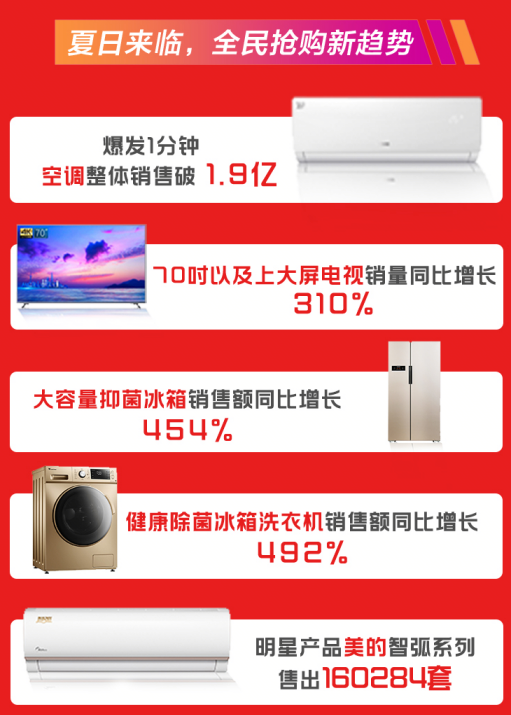 在品類表現上,空調、冰洗、彩電銷售火熱。爆發(fā)1分鐘,空調整體銷售破1.9億,明星產品美的智弧系列18小時售出160284套;截至18時,健康除菌冰箱洗衣機銷售額同比增長492%。