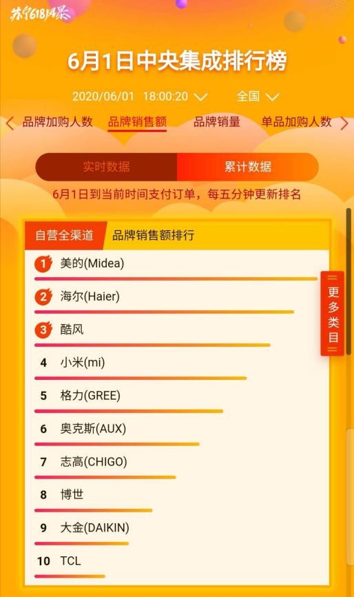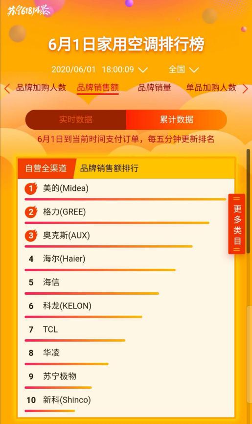 在蘇寧悟空榜,家電板塊火拼激烈,頭部品牌在蘇寧全渠道銷售暴增。截至6月1日18時,美的摘得家用空調及中央集成全渠道銷售額冠王,同時橫跨多品類品牌TOP榜,成為最大贏家。