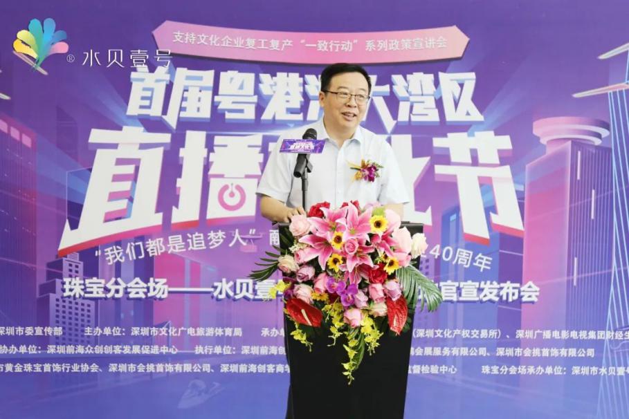 支持文化企業(yè)復(fù)工復(fù)產(chǎn)“一致行動”系列政策宣講會暨粵港澳大灣區(qū)直播文化節(jié)由中共深圳市委宣傳部指導(dǎo),深圳市文化廣電旅游體育局主辦,深圳市文化金融服務(wù)中心(深圳文化產(chǎn)權(quán)交易所)和深圳廣播電影電視集團財經(jīng)生活頻道聯(lián)合承辦,深圳前海創(chuàng)客商學(xué)院有限公司、深圳市毅鵬會展服務(wù)有限公司和深圳市會挑首飾有限公司執(zhí)行舉辦。此次珠寶分會場活動由深圳市黃金珠寶首飾行業(yè)協(xié)會、深圳市會挑首飾有限公司、深圳前海創(chuàng)客商學(xué)院有限公司、國家首飾質(zhì)量監(jiān)督檢驗中心共同主辦,深圳市水貝壹號投資發(fā)展有限公司獨家承辦。