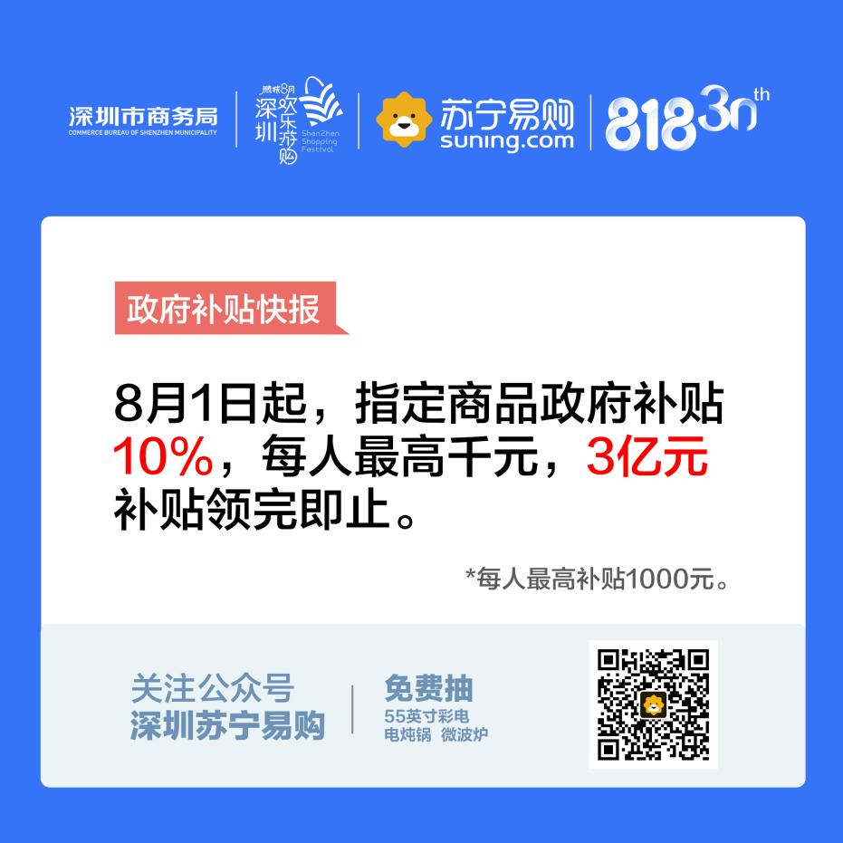 第二屆鵬城八月歡樂(lè)游購(gòu)——深圳家電數(shù)碼消費(fèi)節(jié)在華強(qiáng)北群星廣場(chǎng)自8月1日起拉開帷幕,已向深圳居民推出3億元家電和數(shù)碼產(chǎn)品補(bǔ)貼政策,用戶按實(shí)際購(gòu)買價(jià)格的10%給予補(bǔ)貼,每位居民累計(jì)最高補(bǔ)貼1000元?;浉厶K寧電器店及家樂(lè)福與大潤(rùn)發(fā)近3000件商品均可享用。品類覆蓋齊全,商品選擇范圍廣,為消費(fèi)者帶來(lái)一場(chǎng)盛大家電數(shù)碼消費(fèi)節(jié)的同時(shí)為經(jīng)濟(jì)消費(fèi)做出強(qiáng)有力的貢獻(xiàn)。