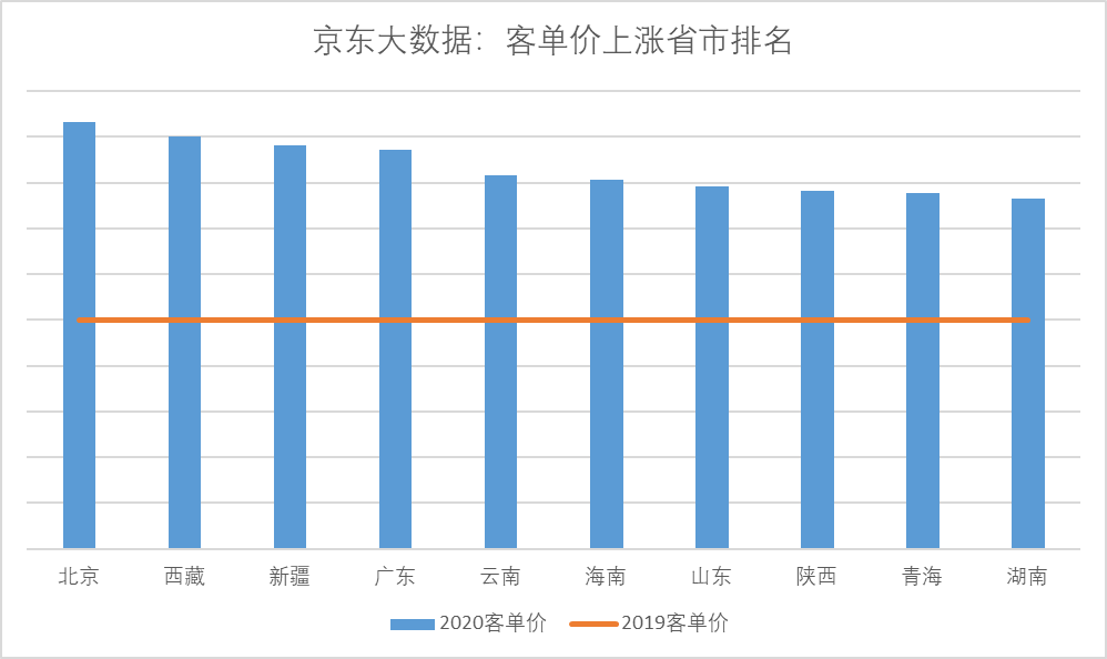 但是,消費(fèi)者采購(gòu)月餅時(shí)卻呈現(xiàn)出更積極的上升趨勢(shì):據(jù)京東大數(shù)據(jù),今年京東平臺(tái)上不但用戶數(shù)大幅增加,其中相當(dāng)大部分新用戶來(lái)自低線市場(chǎng)用戶,而且消費(fèi)者相比去年更加追求品質(zhì),大品牌、高規(guī)格的月餅禮盒熱銷(xiāo),因此月餅平均客單價(jià)比去年上漲了35%以上。下圖可見(jiàn),除北京廣東等發(fā)達(dá)地區(qū)外,客單價(jià)上漲的主要?jiǎng)恿?lái)自于西北、西南和華中等地區(qū)。