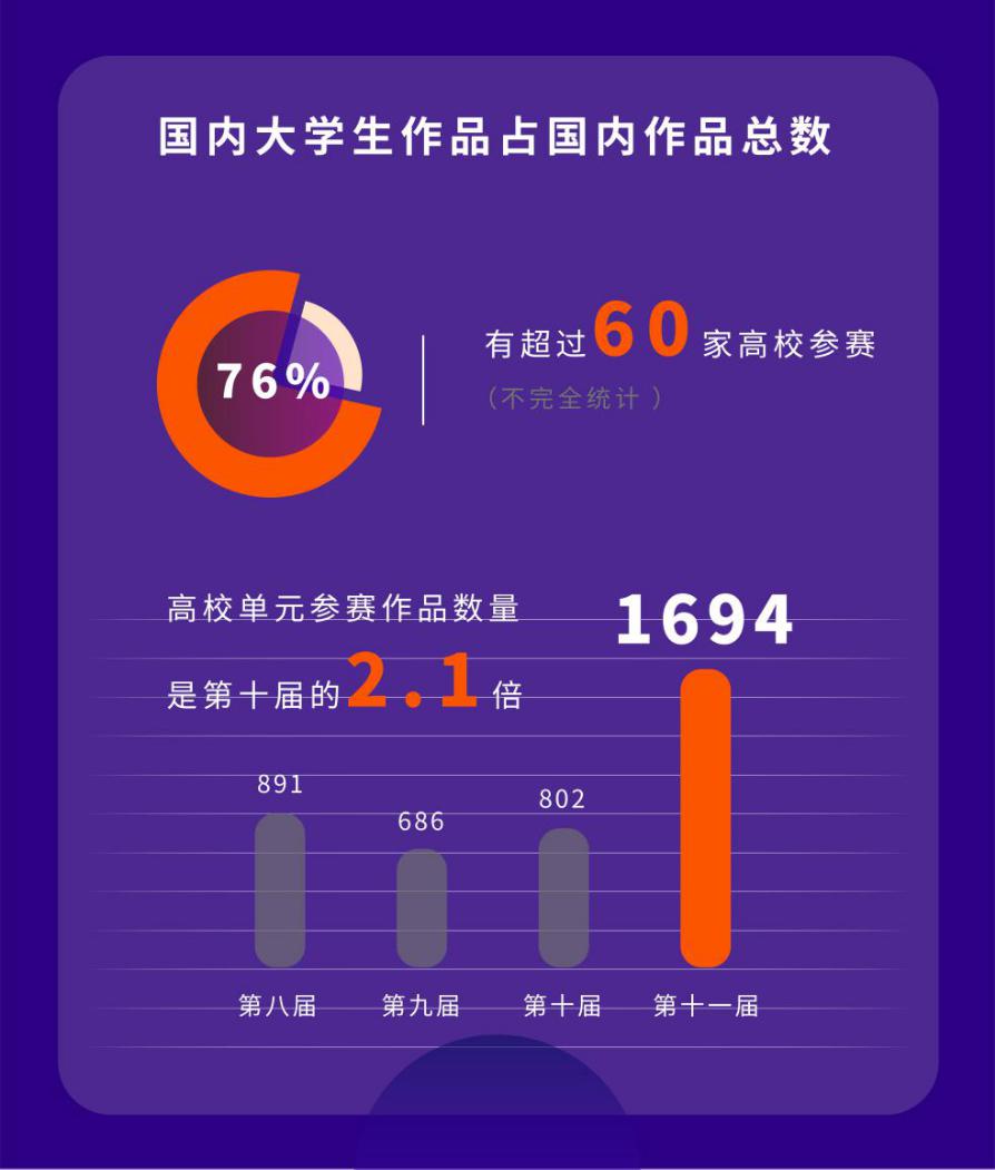作為參與金鵬短片導(dǎo)演扶持計(jì)劃的重要力量,今年高校大學(xué)生的參賽積極性持續(xù)高漲。本屆短片節(jié)發(fā)起的“全國(guó)大學(xué)生視頻創(chuàng)意大賽”共收到來(lái)自全國(guó)超過(guò)60所高校的1694部參賽作品,數(shù)量同比增長(zhǎng)一倍。國(guó)內(nèi)大學(xué)生參賽作品數(shù)量在所有國(guó)內(nèi)參賽作品總數(shù)中占比58%,大學(xué)生創(chuàng)作者一躍成為金鵬短片導(dǎo)演扶持計(jì)劃的中堅(jiān)力量,凸顯了新時(shí)代下年輕創(chuàng)作者對(duì)短片以及短視頻的無(wú)限熱情和興趣執(zhí)著。大學(xué)生競(jìng)賽單元將分別評(píng)選出“最佳大學(xué)生短片”、“最佳大學(xué)生劇情短片”、“最佳大學(xué)生紀(jì)錄短片”、“最佳大學(xué)生動(dòng)畫(huà)短片”、“最佳大學(xué)生VLOG短片”、“最佳大學(xué)生科普短片”、“最佳大學(xué)生廣告創(chuàng)意短片”、“最佳大學(xué)生原創(chuàng)音樂(lè)短片”等9大類(lèi)型入圍優(yōu)秀作品。