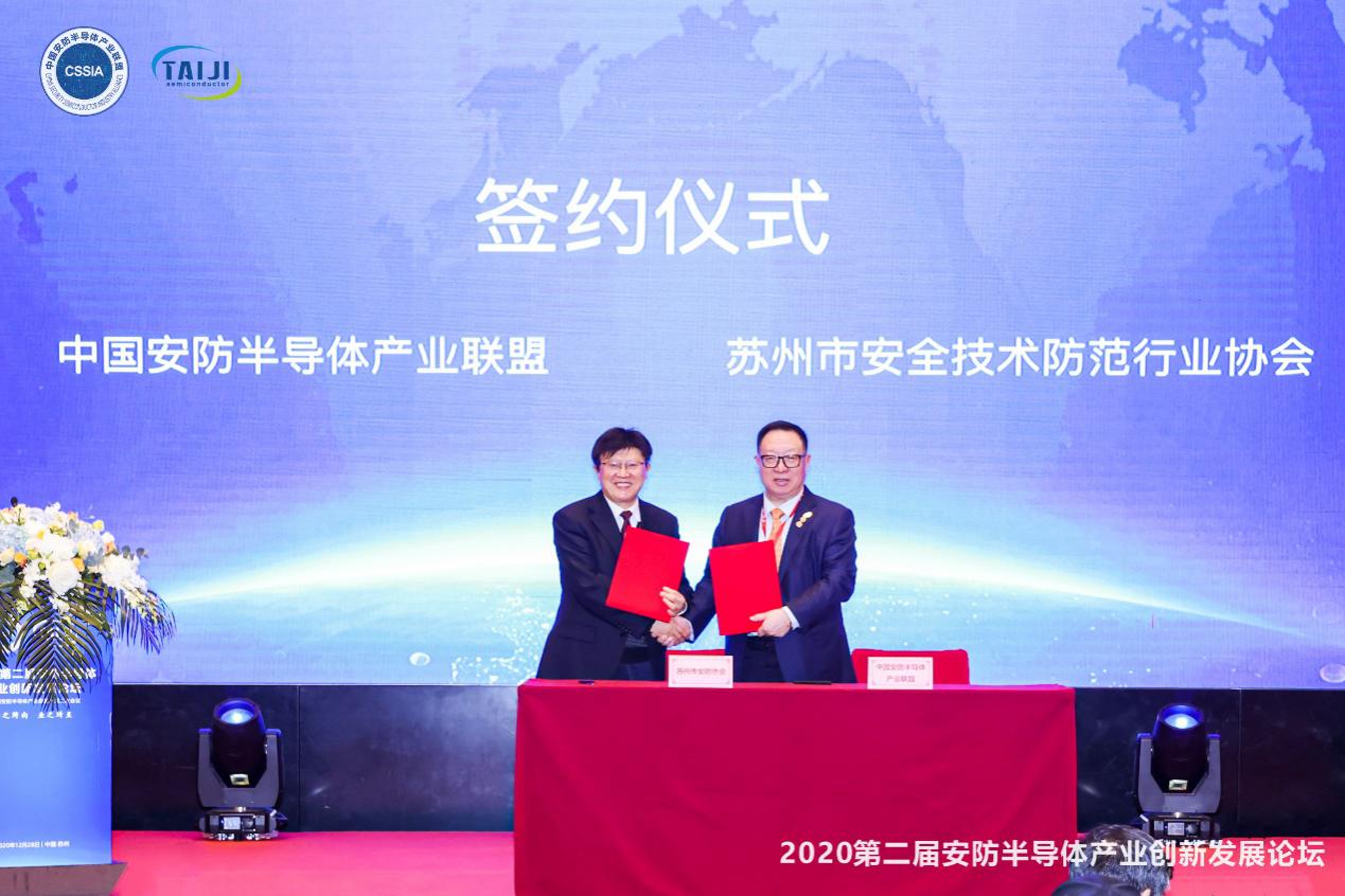 中國安防半導(dǎo)體產(chǎn)業(yè)聯(lián)盟主席楊金才和蘇州市安全技術(shù)防范行業(yè)協(xié)會秘書長王坤泉現(xiàn)場進行簽約