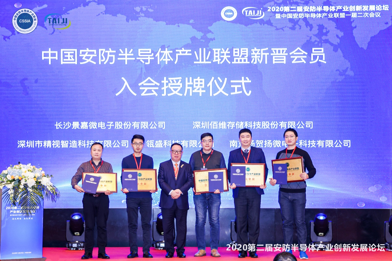 會議尾聲,還舉行了中國安防半導(dǎo)體產(chǎn)業(yè)聯(lián)盟新晉會員單位入會授牌儀式。深圳佰維存儲科技股份有限公司、長沙景嘉微電子股份有限公司榮膺聯(lián)盟理事單位,瓴盛科技有限公司、深圳市精視智造科技有限公司,南京揚賀揚微電子科技有限公司榮膺聯(lián)盟會員單位。中國安防半導(dǎo)體產(chǎn)業(yè)聯(lián)盟主席楊金才為以上單位進行授牌。