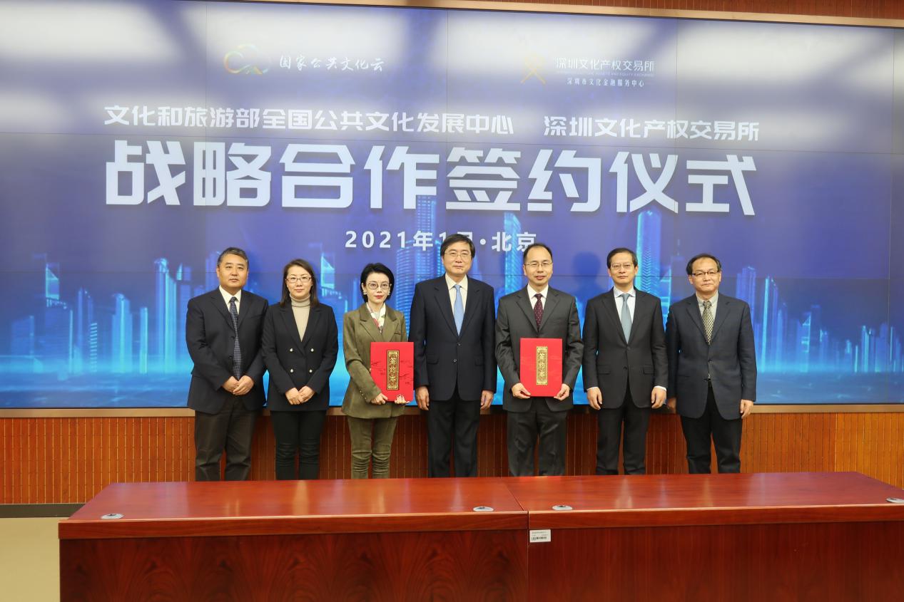 見圳客戶端·深圳新聞網(wǎng)2021年1月13日訊 今日,文化和旅游部全國公共文化發(fā)展中心(以下簡稱“發(fā)展中心”)與深圳文化產(chǎn)權(quán)交易所(以下簡稱“深圳文交所”)在北京簽署戰(zhàn)略合作協(xié)議。文化和旅游部黨組成員、副部長張旭出席并見證簽約儀式。發(fā)展中心主任白雪華主持簽約儀式。發(fā)展中心副主任尹壽松與深圳文交所總經(jīng)理助理、深圳市文化金融服務(wù)中心常務(wù)副主任王曉銳簽署戰(zhàn)略合作協(xié)議。文化和旅游部公共服務(wù)司副司長朱渤、國際交流與合作局副局長鄭浩,以及簽約單位相關(guān)人員參加簽約儀式。