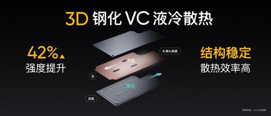 真我GT的性能表現(xiàn),離不開優(yōu)秀散熱技術的強力支持,創(chuàng)新的3D鋼化液冷散熱不乏好評。作為GT系列戰(zhàn)略成員,真我GT Neo繼承了GT系列的強悍基因,同樣搭載3D鋼化VC液冷散熱。創(chuàng)新的3D鋼化VC液冷散熱不僅大幅度提高了均熱板的強度,同時內部的結構優(yōu)化也讓整體的散熱效率進一步提升。配合100%覆蓋核心發(fā)熱源的多重立體散熱系統(tǒng),高性能的同時保持冷靜。