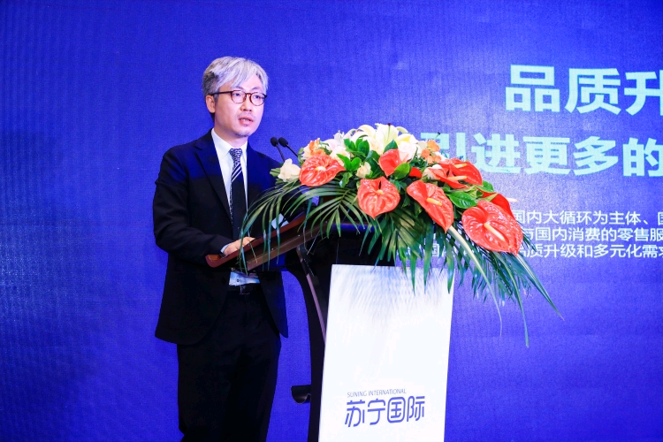(圖:首屆消博會(huì)期間,蘇寧家樂(lè)福商品副總裁陳尚斌在蘇寧國(guó)際全球合作伙伴大會(huì)上發(fā)表演講)