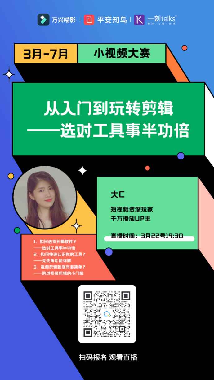 據(jù)悉,#一分鐘SHOW職場(chǎng)干貨#小視頻大賽自3月求職季上線,將持續(xù)至7月底,為期4個(gè)月,大賽包含作品提交至平安知鳥APP、12場(chǎng)線上直播、線上初賽、晉級(jí)復(fù)賽、線下決賽及頒獎(jiǎng)典禮等環(huán)節(jié)。根據(jù)規(guī)劃,大賽設(shè)有專家評(píng)審委員會(huì)、培訓(xùn)專家團(tuán),并設(shè)置數(shù)十萬獎(jiǎng)金池,獲獎(jiǎng)?wù)卟粌H將有機(jī)會(huì)瓜分獎(jiǎng)金大獎(jiǎng),更有機(jī)會(huì)成為職場(chǎng)知識(shí)網(wǎng)紅“C位”出道。萬興喵影作為活動(dòng)主辦方之一,在此次大賽中將提供視頻創(chuàng)意軟件工具、活動(dòng)專用視頻資源包、千萬播放UP主視頻制作講解直播課等資源,全方位賦能選手輸出高品質(zhì)內(nèi)容。