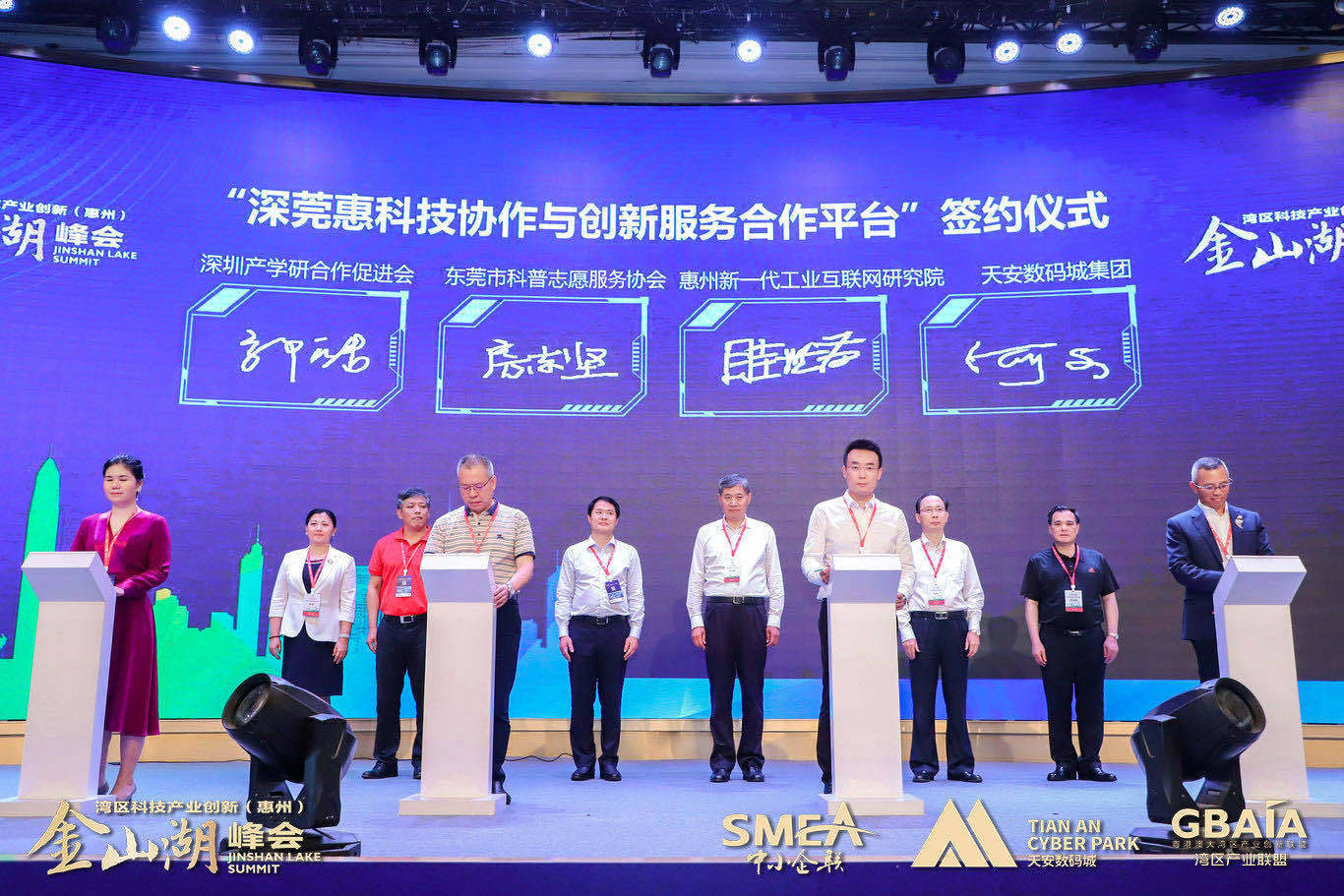 峰會(huì)當(dāng)天,在廣東省科學(xué)技術(shù)協(xié)會(huì)黨組書記鄭慶順,惠州市委常委、市政府常務(wù)副市長何廣延,深圳市科學(xué)技術(shù)協(xié)會(huì)黨組書記林祥,東莞市科學(xué)技術(shù)協(xié)會(huì)一級(jí)調(diào)研員李小兵,惠州市科學(xué)技術(shù)協(xié)會(huì)黨組書記羅金星,惠州市科學(xué)技術(shù)協(xié)會(huì)主席費(fèi)霞的見證下,深圳產(chǎn)學(xué)研合作促進(jìn)會(huì)郭皓、東莞市科普志愿者協(xié)會(huì)房志堅(jiān)、惠州新一代工業(yè)互聯(lián)網(wǎng)創(chuàng)新研究院眭世榮、惠州市天安數(shù)碼城有限公司何文共同上臺(tái)簽約,正式開啟深莞惠科技協(xié)作與創(chuàng)新服務(wù)新篇章。
