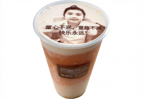 建議由孩子把自己或家人的照片加上一句話祝愿的話,作成圖片先保存到手機(jī)里。到店后,在云客茶語(yǔ)小程序上傳打印到奶茶上。整個(gè)制作過程約10分鐘。