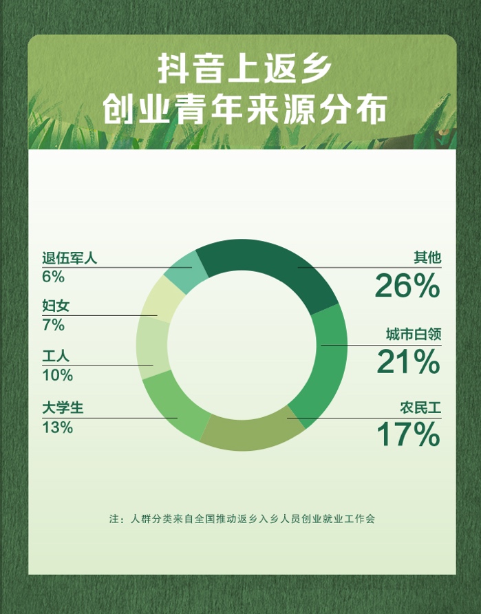 6月22日,抖音發(fā)布首份三農(nóng)數(shù)據(jù)報(bào)告(以下簡(jiǎn)稱(chēng)“報(bào)告” )。過(guò)去一年,抖音農(nóng)村視頻總獲贊量129億,農(nóng)村視頻創(chuàng)作者收入同比增長(zhǎng)15倍。抖音三農(nóng)創(chuàng)作者中,返鄉(xiāng)創(chuàng)業(yè)青年占比54%,城市白領(lǐng)返鄉(xiāng)創(chuàng)業(yè)比例最高,其次為農(nóng)民工。報(bào)告還從三農(nóng)創(chuàng)作者來(lái)源最多的省份縣域、最受歡迎的三農(nóng)視頻內(nèi)容等多角度解析目前抖音三農(nóng)內(nèi)容生態(tài)。