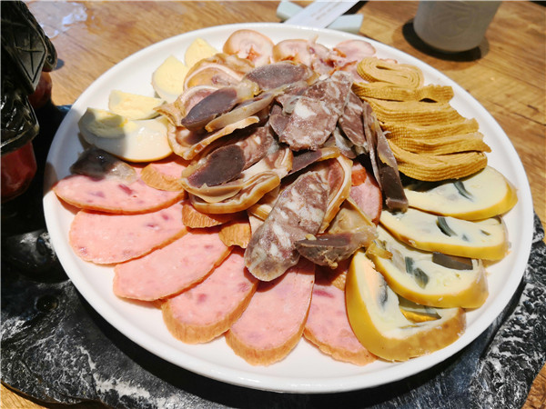 尤其扎眼的,正對(duì)大門的明廚亮灶上的幾塊牌匾,一下子就勾起人的食欲:老式熏豬手、手工燒老雞、烏蘇里江鰉魚、興凱湖大白魚、查干湖胖頭魚、火夫灶羊腿。這些都是地道的東北味啊!據(jù)介紹,老板湯長(zhǎng)明是黑龍江“龍菜”系傳承領(lǐng)軍人物,祖孫四代傳承東北菜廚藝,現(xiàn)在關(guān)東大院餐飲集團(tuán)董事長(zhǎng)。當(dāng)然,許多大家耳熟能詳?shù)拇蟊姴艘矐?yīng)有盡有,如:殺豬菜、小雞燉蘑菇、得莫利燉魚、大鵝燉寬粉、黑皮肘子、酸菜粉、地三鮮、東北鹵水點(diǎn)豆腐、金湯遼參、黃魚燒土豆、紅燒肉黃金勾......看得人口水直冒。加之,整個(gè)門店的布局也十分特別,一樓明廚亮灶之外,主要是大堂散座,周邊還有不少的書籍、酒架;二樓主要是包間,簡(jiǎn)潔明亮??梢哉f,在此可以感受到一股濃濃的關(guān)東風(fēng)情。